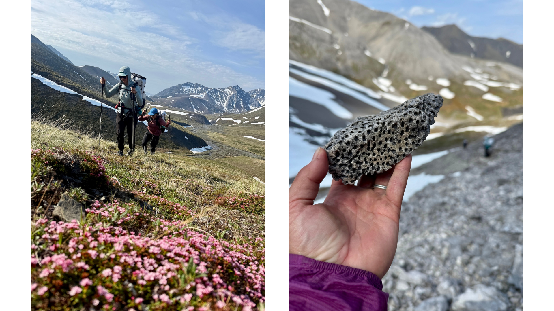 After that first snowy stretch, The Brooks gifted us with such fun and friendly terrain – lined with caribou trails at just the right incline that contoured up the passes. Inside the bends and folds of the mountains we moved up, we would encounter an occasional snowy patch, but were able to make light work of those steeper snow crossings as we worked our way up towards ridgelines, finding fossil treasures along the way.